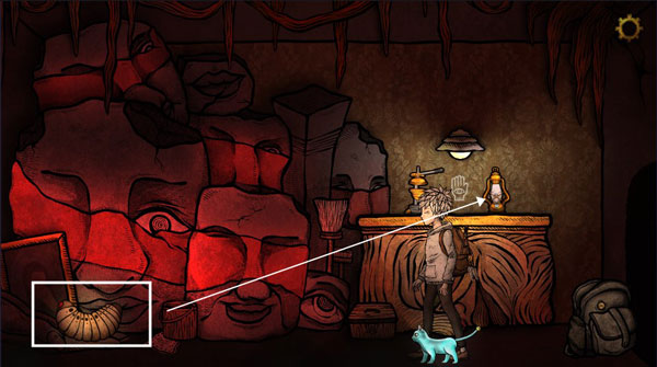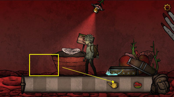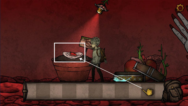 7、将玫瑰花给女人,进入嘴巴,白框处拿到一个蚕蛹,将蚕蛹放到机器里,使用机器获得绿色燃料,将燃料放入右边的灯具里,获得发光的灯