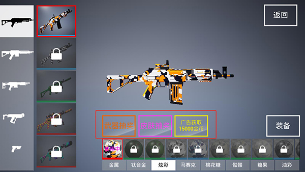 4、可以通过武器抽奖、皮肤抽奖和广告获取得到更多的武器。