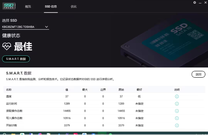 现代硬盘使用一种系统进行自我监控,称为SMART(自我监控,分析与报告技术)系统。它分析磁盘,并且在它们可能造成数据丢失之前已经指示了缺陷。读取此信息并将其显示在窗口中。