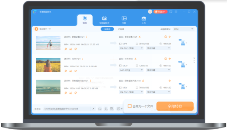 5.开始转换:设置完毕后,选择下方的全部转换开始批量转换视频文件。