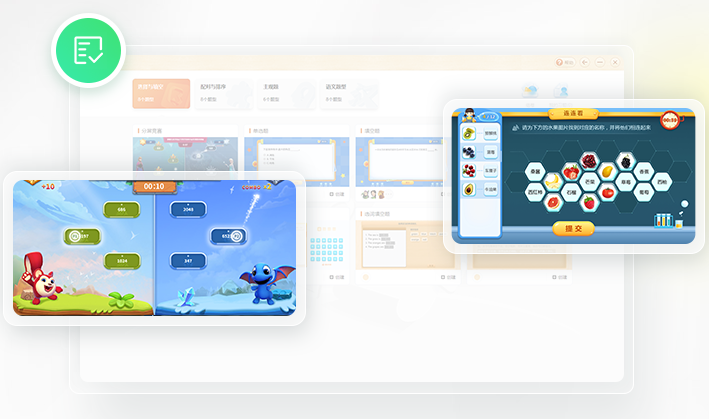 基础题型简单创建,各学科趣味题型、蒙层工具、分屏竞赛等帮助学生轻松巩固课堂知识点。