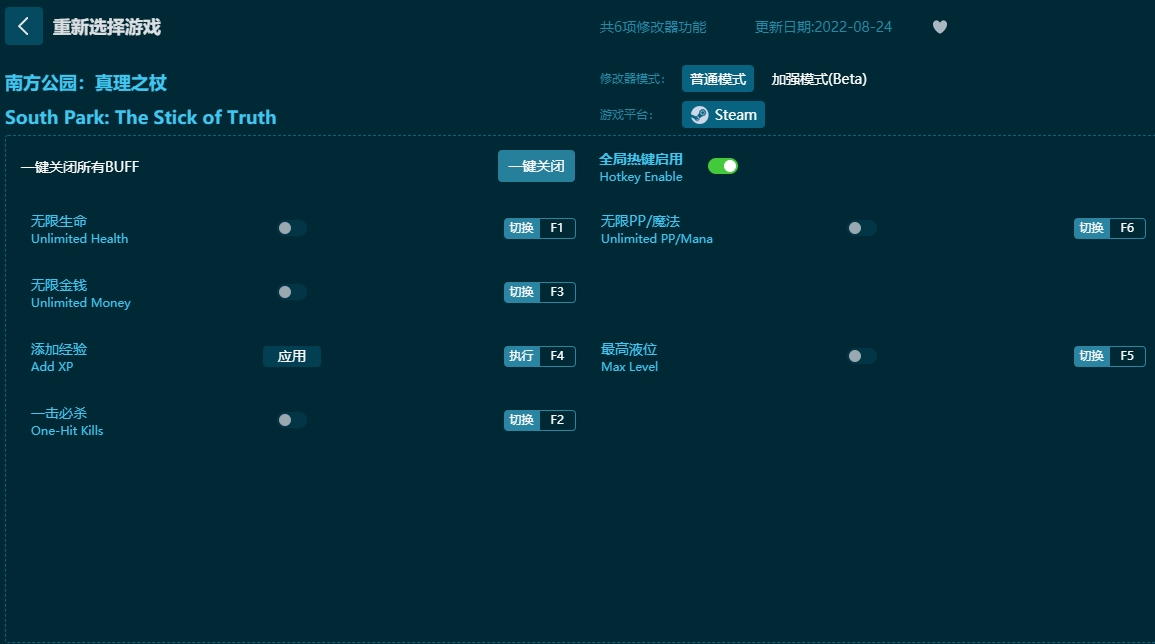 《南方公园:真理之杖》是一款非常好玩的角色扮演游戏,游戏的故事背景发生在一座南方公园的小镇里面,由一位来自小镇的新星英雄担任起拯救这个地方的救星,在某一天的小学操场上,出现了一股可怕且邪恶的势力,他们的出现注定将会给这个地方带来灾难,玩家将扮演这位小英雄踏上清除邪恶的冒险道路,为增加游戏体验性,特此提供南方公园:真理之杖六项修改器供玩家使用,感兴趣就来看看吧。