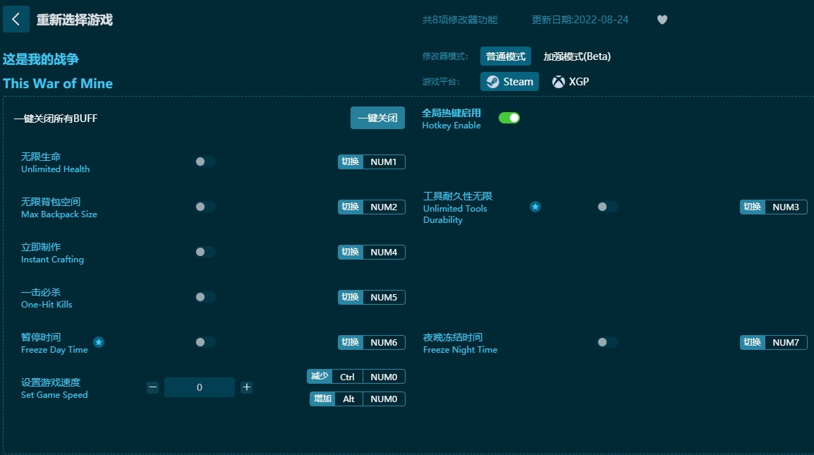 这是我的战争八项修改器内容及热键: