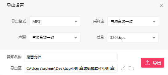 在导出窗口中设置文件名称和参数,点击“确定”导出音频。