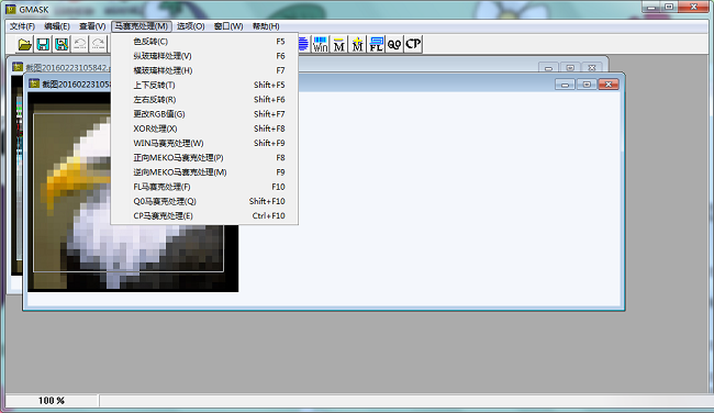 CP马赛克、QO马赛克、FL马赛克、正向MEKO马赛克、逆向MEKO马赛克、WIN马赛克、横毛玻璃、纵毛玻璃、正负片反转、左右反转、上下反转、XOR0X80、更换RGB值。