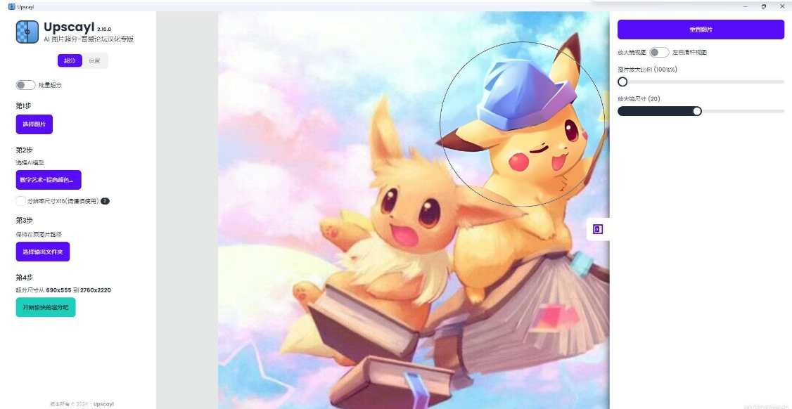 1、除了原有的左右滑杆对比视图模式,添加了新的原图-AI效果图对比模式:放大镜模式,如图1所示,可以很方便的让大家使用放大镜的放大圈,直接对比区域内的AI超分结果,设置页也细化了很多选项。