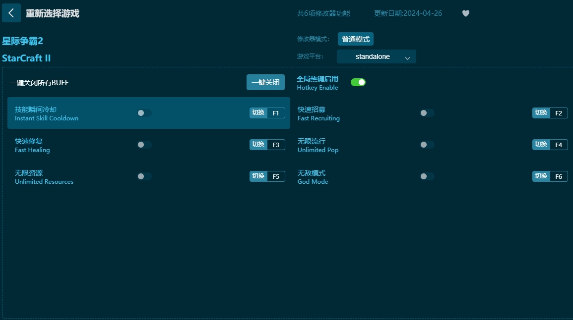 《星际争霸2》是一款由暴雪公司出品的即时战略类游戏,该作是《星际争霸》的第二部正统续作,在该作中采用了3D虚幻引擎制作,在保留了一代的基础玩法上增加了大量新元素,并且二代是延续了一代的故事剧情,这些结合起来让玩家能够拥有更舒适的视觉体验以及操作手感,为增加游戏体验特此提供星际争霸2六项修改器供玩家使用,感兴趣的话就来看看吧。