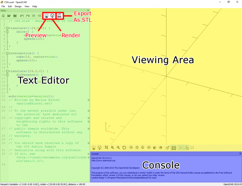让我们首先查看OpenSCAD窗口的基本部分。OpenSCAD的界面非常简单,仅包含文本编辑器,查看区域和控制台。使用编辑器输入代码,结果模型显示在查看区域中。编辑器中的大多数按钮都是不言自明的(New,Open,Save等)。有趣的是预览,渲染和导出为STL按钮。