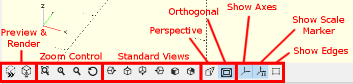 最后一组按钮包括Perspective / Orthogonal按钮,Show Axes和Show Scale Marker按钮以及Show Edges按钮。在Orthogonal和Perspective之间切换会更改模型是以等距还是透视显示。(正交视图通常更适合制作机械模型,而透视更适合装饰模型)。