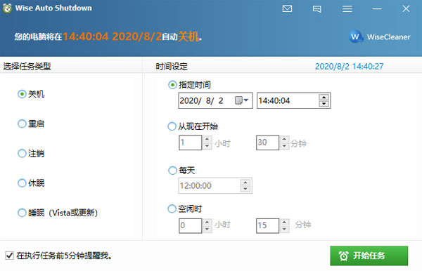Wise Auto Shutdown时间设定十分灵活,用户除可以设定每天固定某个时间执行任务外,还可以设定在某个指定时间点,空闲时间,甚至是从现在开始几小时几分钟之后执行。最重要的是Wise Auto Shutdown会在执行设定任务前5分钟自动提醒,避免自动关机时措手不及,用户也可以根据实际情况选择推迟执行任务。