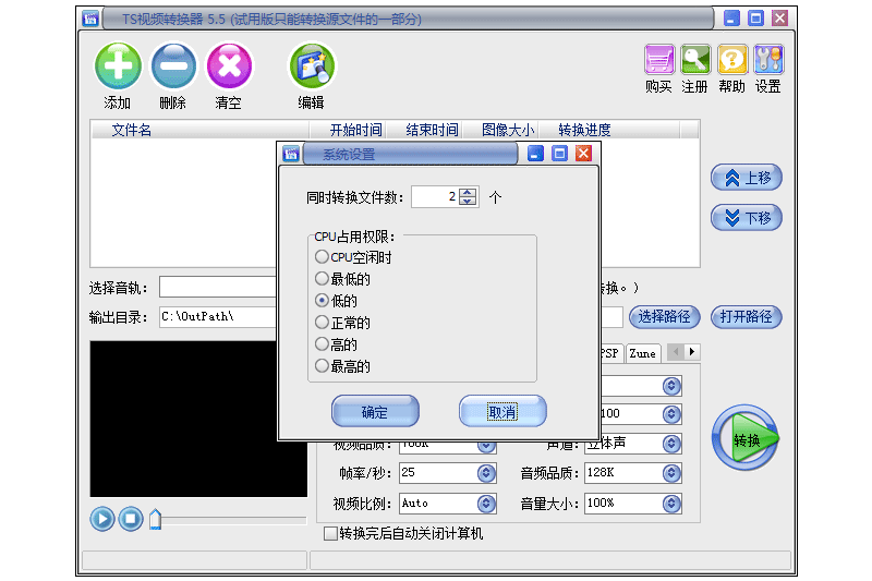 步骤6:点击软件窗口右上角的“设置”按钮,可以设置同时转换文件数量,软件采用国际最先进多媒体编解码技术,可以同时转换多个视频,用户可以根据您的电脑CPU能力来选择CPU占用权限,方便您同时处理多项事务;