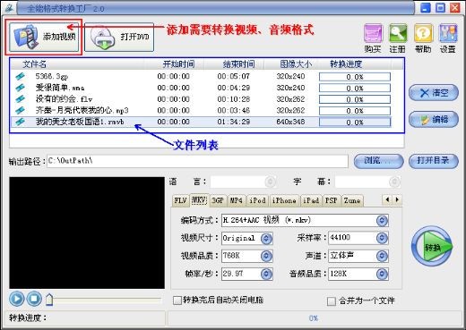 转换输出视频格式 AVI、FLV、F4V、MKV、3GP、MP4、VCD、SVCD、DVD、WMV、ASF、AVI高清、H.264高清、MP4高清、WMV高清、ASF高清、MKV高清、MOV高清