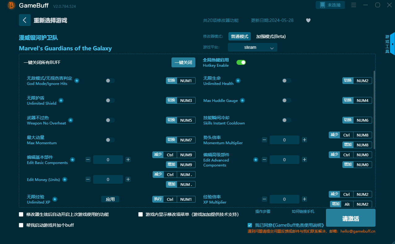 漫威银河护卫队修改器是一款游戏辅助工具,在游戏中使用修改器可以让游戏更加的具有游戏体验感,这款游戏修改器的使用功能也非常的简单,下载修改器以后搜索游戏,打开修改页面,你可以看到修改器的修改器页面,有无限生命,换弹速度,无限能量,技能无冷却等多种辅助功能,非常的实用,感兴趣的玩家们抓紧时间下载安装吧!