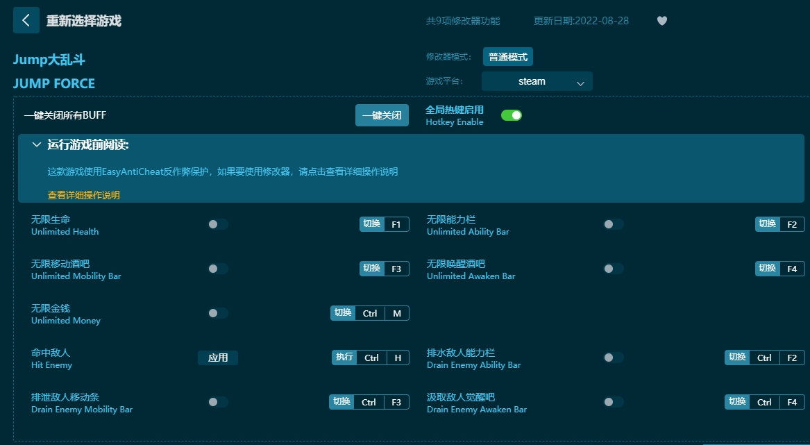 Jump大乱斗九项修改器使用说明: