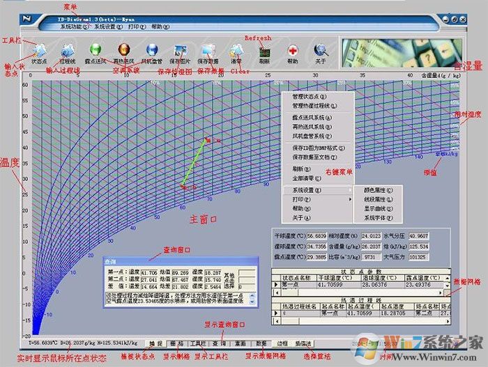增加了计算功能(计算排风量、计算混风比、计算湿热比、计算除湿量)单独操纵是不是绘图等温线、等湿线、等焓线、等空气湿度线