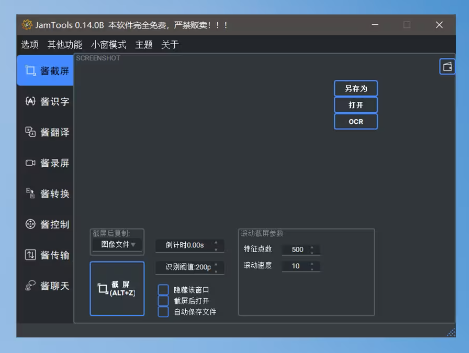 JamTools是一个跨平台的小工具集类软件,支持Windows、Macos、ubuntu系统。包含了(滚动/区域)截屏、录屏、(离线)文字识别、多种语言互译、多媒体格式转换、鼠标键盘动作录制播放、局域网文件传输、聊天机器人等功能,完全开源!