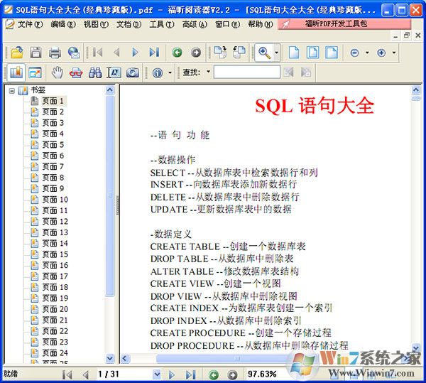 SQL语句大全是一款pdf中文版的高清电子书,是目前最完整的经典珍藏版本。详细的介绍了sql语句的数据操作,数据定义,数据控制,事务控制,程序化sql,局部变量,全局变量,系统函数等命令,是初学者,程序设计员必学的数据库操作语言。