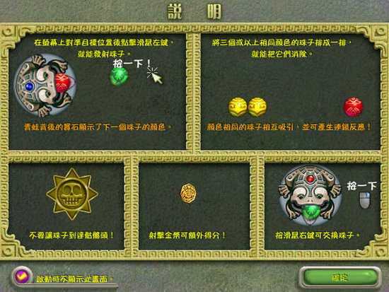 《祖玛传奇》是一款老少皆宜的益智类游戏,主角是一只石青蛙,它会吐出各种颜色的小球。小球造型美丽并且有着神秘的色彩,环绕着石青蛙的是载着小球的轨道,各种颜色的小球会沿着轨道 向前滑动。石青蛙阻止小球滚进轨道终点的洞里的方法就是用吐出小球与轨道上的小球相结合,颜色相同且数量达到三个以上就会消除得分。屏幕右上方有一个分数格。当达到一定分数(黄色的气满)的时候游戏中会听到 “ZUMA”的声音,然后所有小球倒退若干步。这是一个表面现象,这个分数格最重要的作用是表示该版的结束,当“ZUMA”叫出后,就不会再增加小球了,也就是说消除完眼前的所有小球就能过关了。