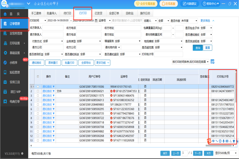2、批量打印:顺丰丰密电子面单、顺丰丰密A4电子面单顺丰港澳台跨境电子面单等
