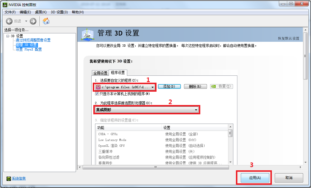 3、接着, 在管理3D设置界面中, 选择 “程序设置”。