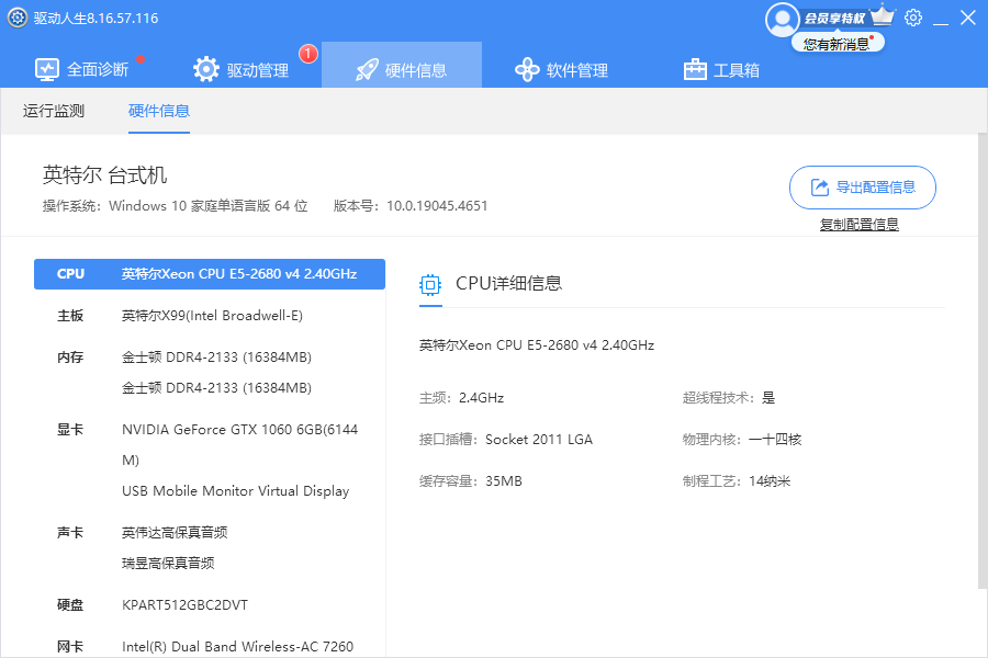 硬件信息检测:可以详细展示计算机的硬件配置信息,包括处理器、显卡、声卡、网卡等。
