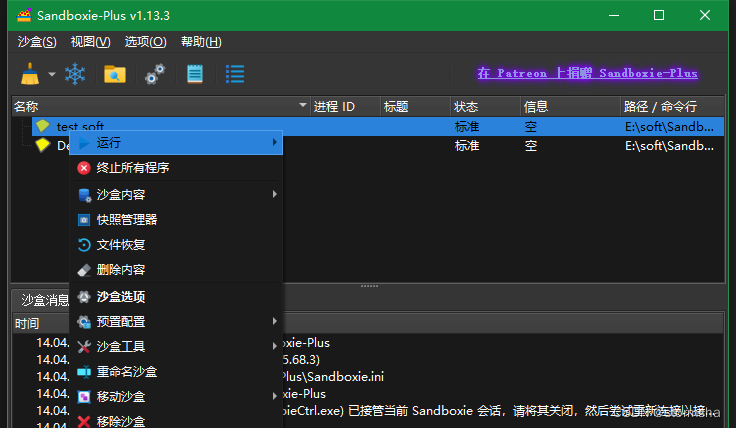3、一个沙箱中可以同时运行多个程序,在沙箱中运行的程序对系统进行的修改都是“虚幻”的,不会对系统造成实质上的影响;