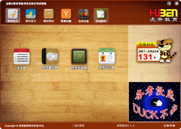 全国计算机等级考试无纸化考试系统是虎奔教育官方出品的计算机二级考试软件,通过全国计算机等级考试无纸化考试系统用户能够模拟进行科目考试,软件涵盖了11种计算机二级考试科目,题目每次都会更新,都是历年真题,用户可以进行模拟考试,测试知识掌握情况,增加通过概率!