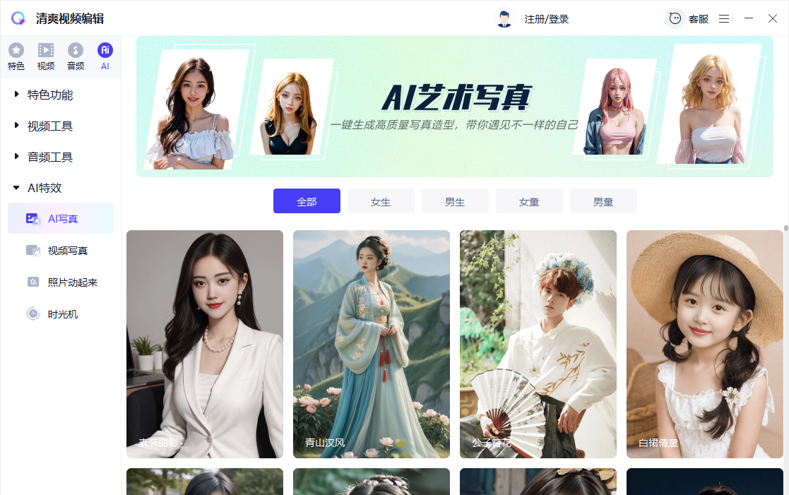清爽视频编辑免费版是一个功能丰富的视频编辑软件,拥有视频剪辑、音视频格式转换、音视频转文字、图片转换、屏幕录制等多种特色功能,视频工具箱和音频工具箱为你提供了齐全的音视频处理工具,可以完成绝大部分的音视频处理操作。内置AI工具,可以把你的照片、视频转换为特定风格的写真、vlog。
