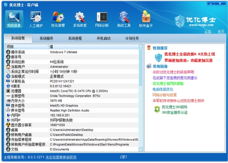 优化博士电脑体检将对您的电脑系统进行快速一键扫描,针对木马病毒,系统漏洞,系统安全,恶意插件,系统启动项、服务、进程、注册表等,并全面诊断解决潜在的系统安全故障,提高电脑运行速度