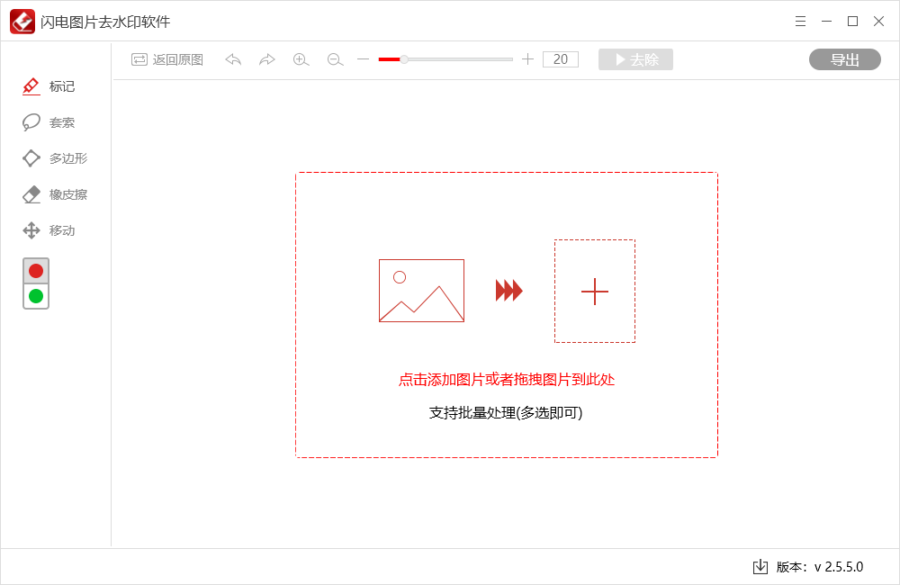 支持标记、套索、多边形、橡皮擦、移动等功能,去水印更方便。