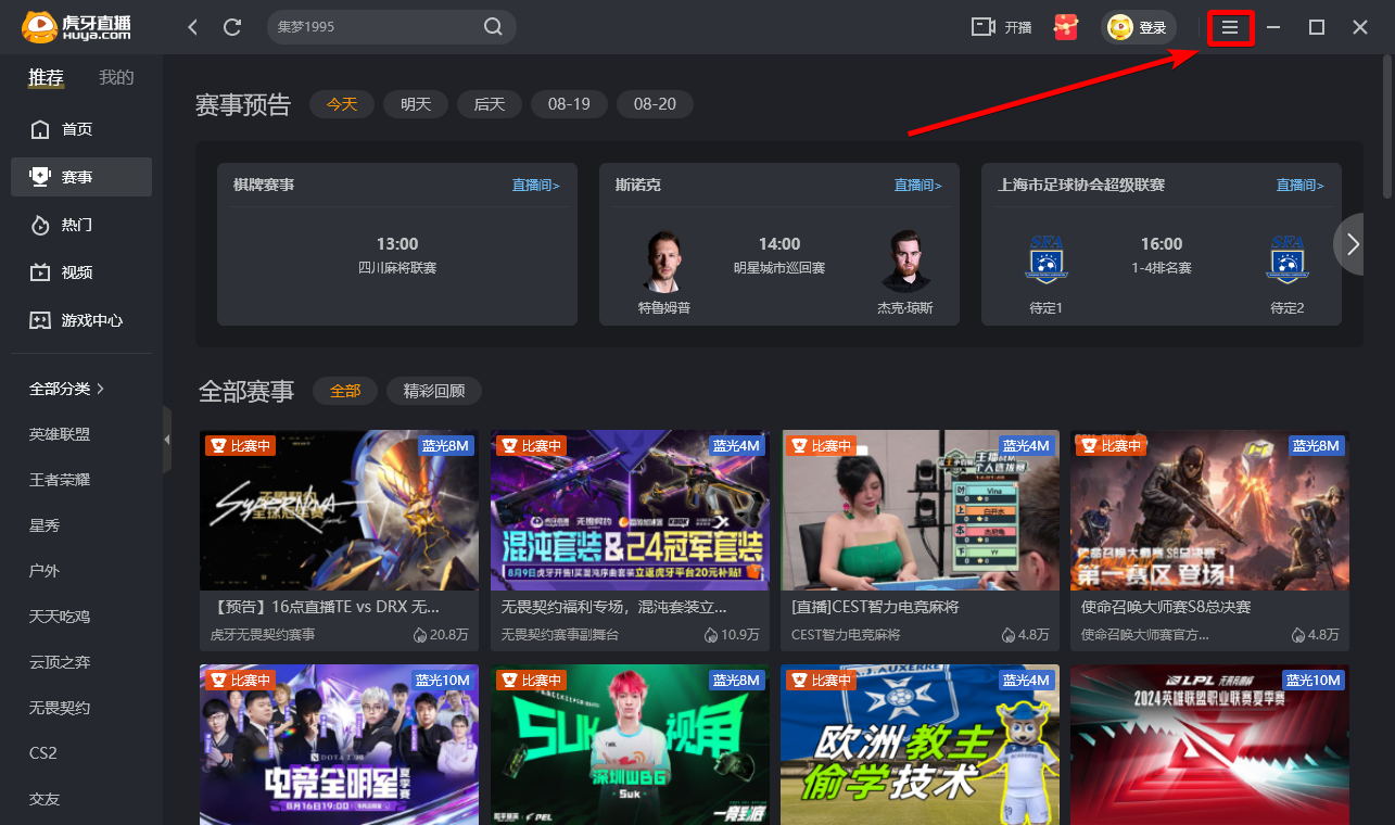 1、打开虎牙直播PC客户端,点击右上角的“三条横杠”图标