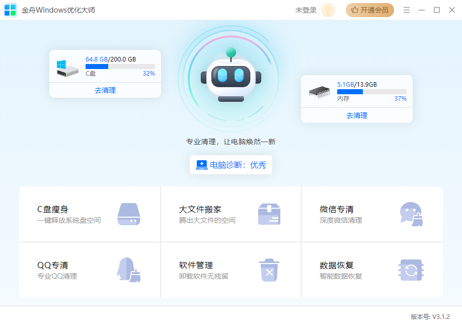 金舟Windows优化大师是一款免费的电脑系统清理优化软件,可以一键清理C盘,使C盘空间爆满的情况得到缓解。支持大文件搬家、内存清理、微信清理等多种垃圾清理功能,全方面优化系统,使电脑运行更流畅。界面简洁,操作简单,对用户很是友好,有需要的朋友快来下载使用吧。