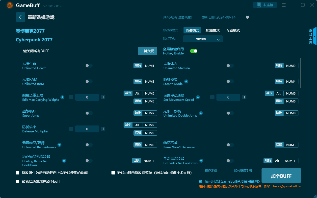 赛博朋克2077四十六项修改器是一款热血战斗的竞技对战游戏,大家将在这个充满了科幻的未来世界中去体验一场全新的玩法,以及各种流畅的动作招式与独特的战斗技巧与方式,还有着许多丰富多样化的玩法,本站为大家带来的是可以去自由的修改设置拥有无限生命,超级跳跃,无限体力,隐身模式,无限二段跳,物品不减,无限物品等功能,感兴趣的朋友们千万不要错过哦,快来本站下载体验一下游戏吧!