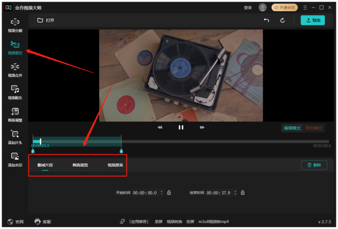 用户可以自定义对视频进行不同程度的剪切,包括删减片段,画面裁剪,视频原声调整。