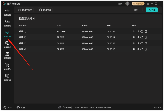用户可以添加多个不同格式的视频进行合并,任意调整先后顺序,一键合并导出。
