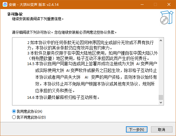 1、下载安装程序并打开,勾选我同意此协议并滚动许可协议到底端,点击下一步