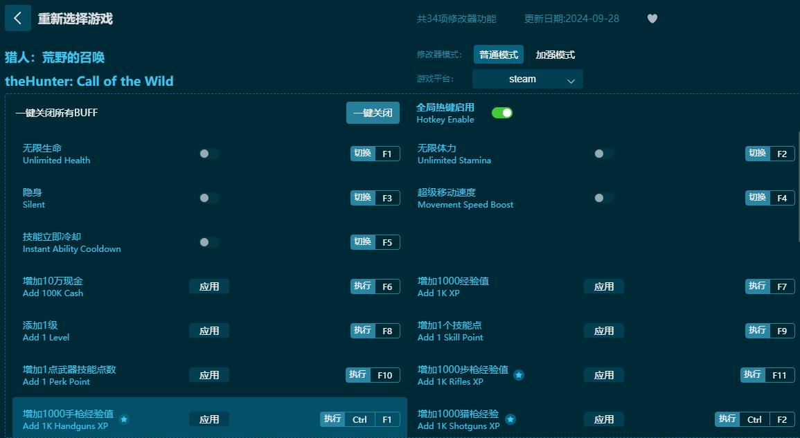 猎人:荒野的召唤三十四项修改器普通模式 (支持 34 项修改,不支持联网模式)