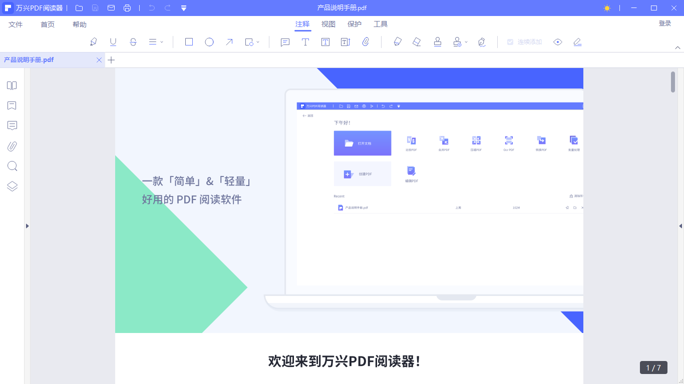 万兴PDF阅读器是从万兴PDF中衍生而来,没有了复杂的功能,只保留了阅读和注释功能,打开文档的速度更加快