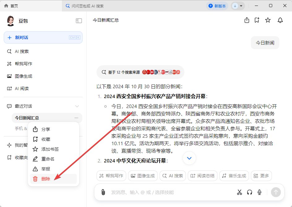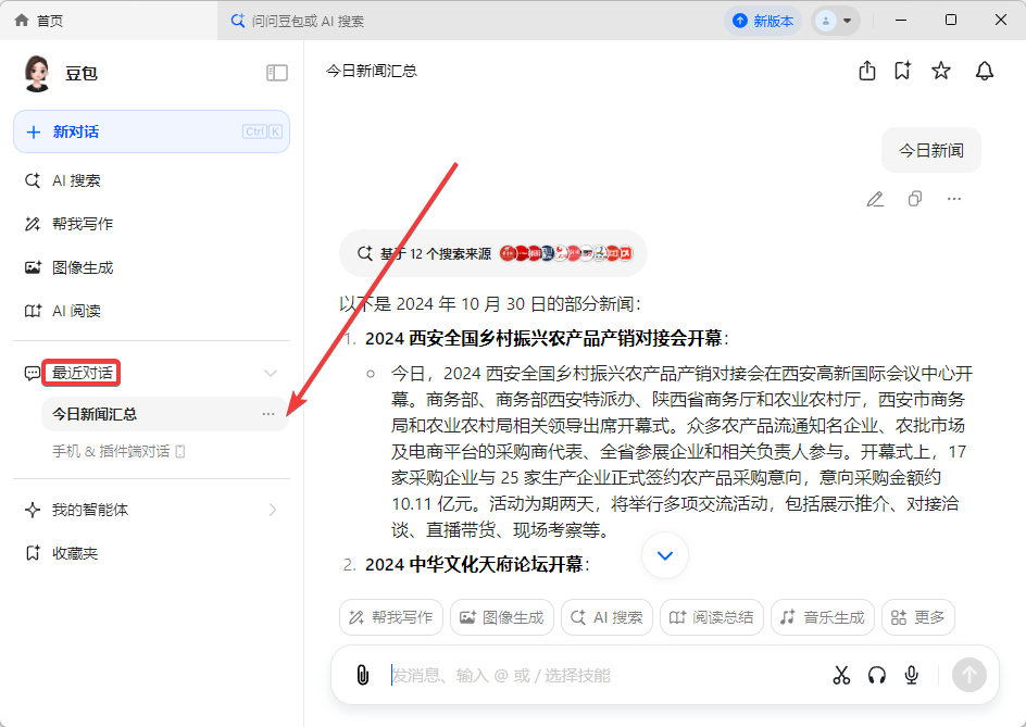 「问问豆包」支持保留对话历史,方便接着前文继续聊电脑版
