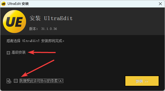 1、下载UltraEdit安装程序并打开,点击高级安装,勾选我接受