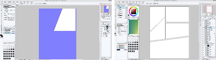 使用格子框工具和框线裁刀工具,可使格子的分割变得轻而易举。您只需拖动框线裁刀工具,即可轻松地分割画格,或创建形状复杂的格子。 分割格子后自动生成格子框组,从而方便以格子为单位,管理图像和素材。