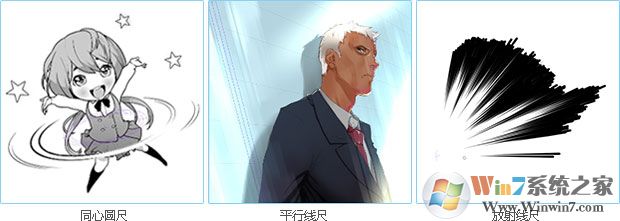 优动漫 PAINT EX版中加载的效果线,可表现多种效果,如速度感、方向感、心理状态等。其中包含平行线、放射线、放射曲线和同心圆等多种不同形态的尺子。