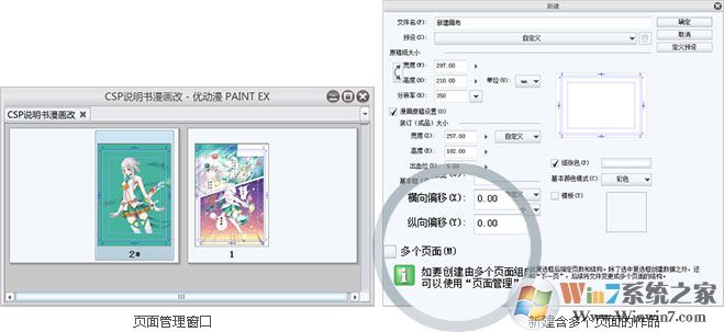 可管理包含多个页面的作品。在作品管理窗口中,可添加页面、调整页面编号、将跨页拆分为单页。另外,在作品信息面板中,还可对装订位置、作品名称、集数、页码(页面编号)的位置、尺寸和起始编号等项目进行设置。
