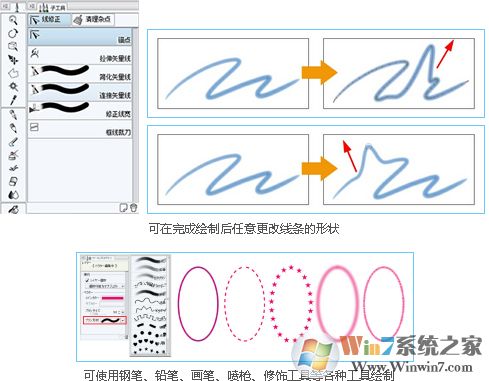 除钢笔工具之外,矢量格式还使铅笔和画笔工具的表现力得以发挥。缩放操作不影响线条的美观,您可以在完成绘制后加粗或减细线条。另外,矢量格式还支持在描画时消除到线与线的交点、遇上重叠的线条可仅消除其中一根,很是方便。