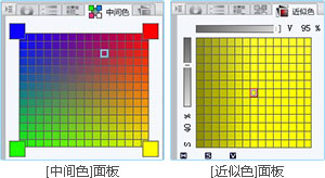 除具备色板面板、色相环和颜色滑块的功能之外,软件还有中间色和近似色面板,可以助您找到理想的颜色。在中间色面板中,可最多建立4种颜色的中间色。 在近似色面板中,通过指定色相、饱和度、明度、亮度等条件,选择相似的颜色。