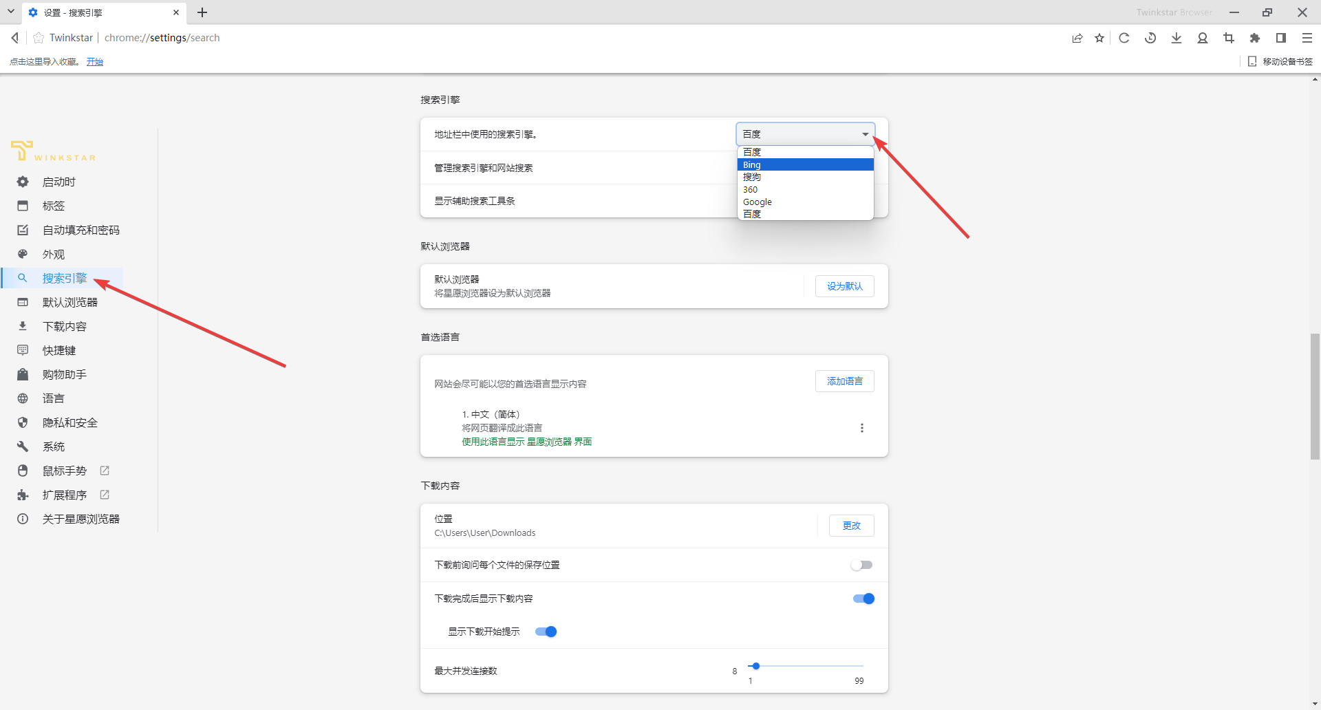 2、在【搜索引擎】设置中,点击下拉栏,选择想要使用的搜索引擎即可