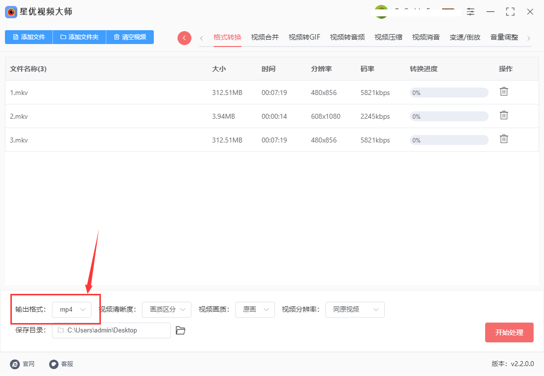 步骤4,点击红色的“开始处理”按钮,软件将开始将mkv文件转为MP4格式,视频转换是比较慢的,需要大家耐心的等待一会。