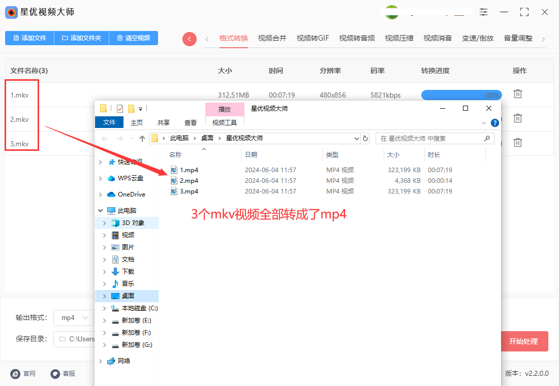 步骤5,转换完成后软件会自动弹出输出文件夹,转换成的mp4视频文件就保存在这里。从结果可以看到,添加到软件里的3个mkv视频被成功的转成了mp4格式。