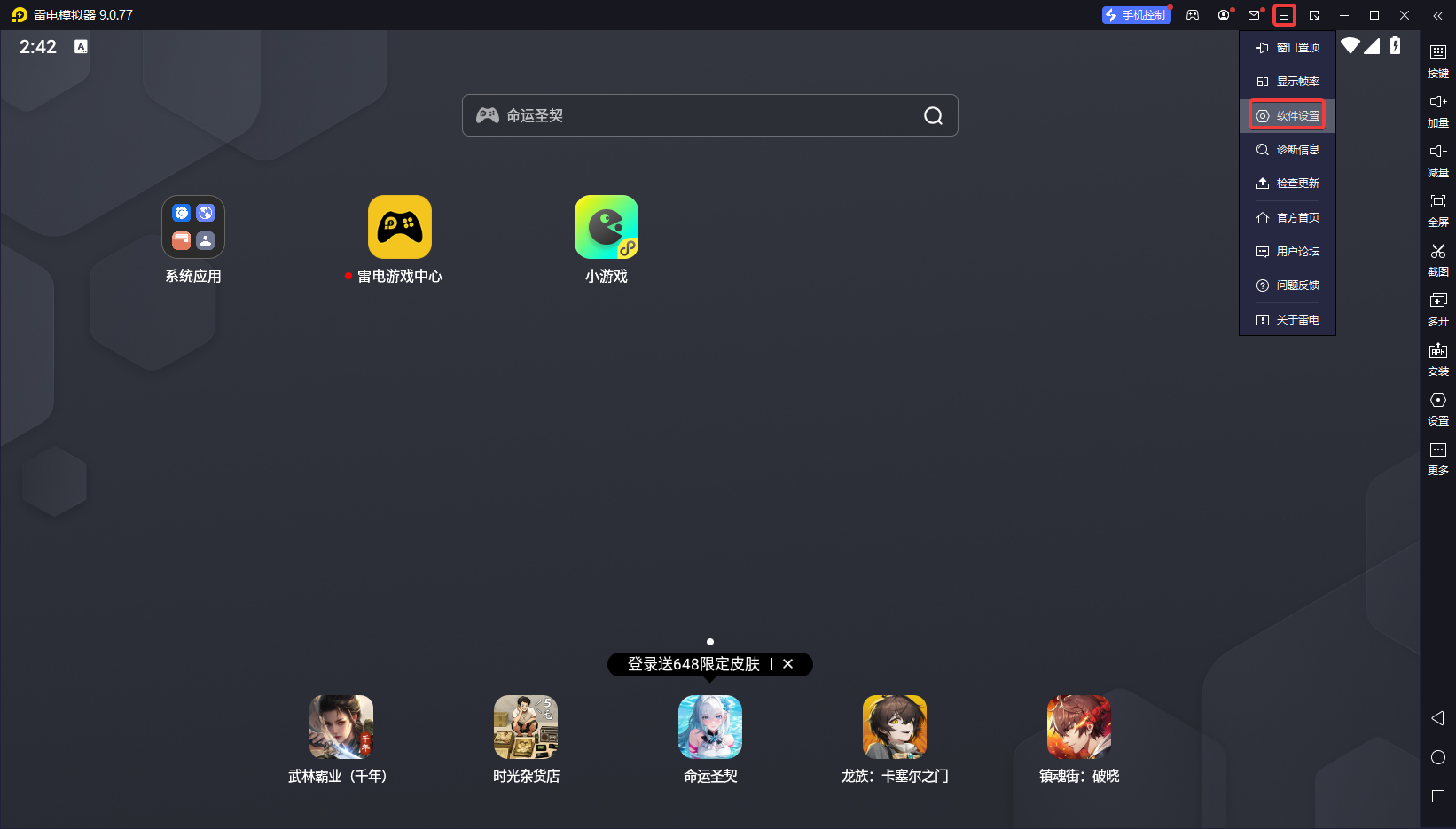 1、打开雷电模拟器,点击右上角的三横,在弹出的列表中选择软件设置