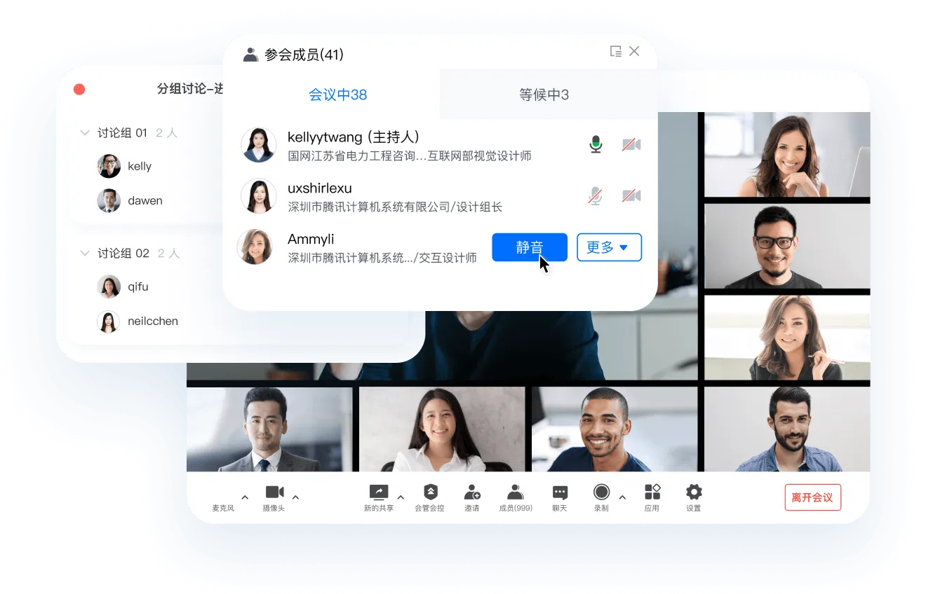 提供独立等候室,确保核心问题核心人员讨论;会中提供指定闭麦功能,会议期间不再聒噪